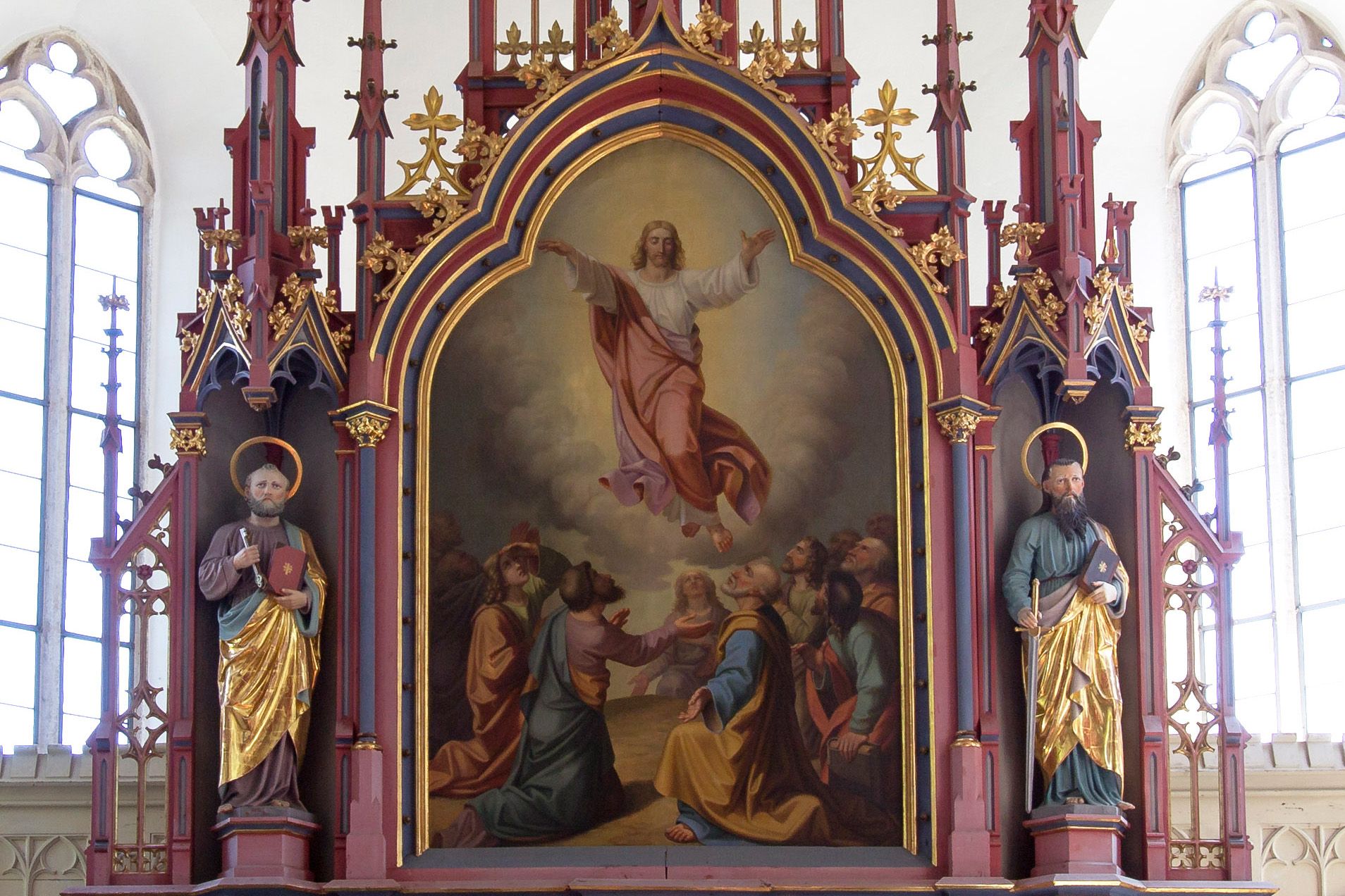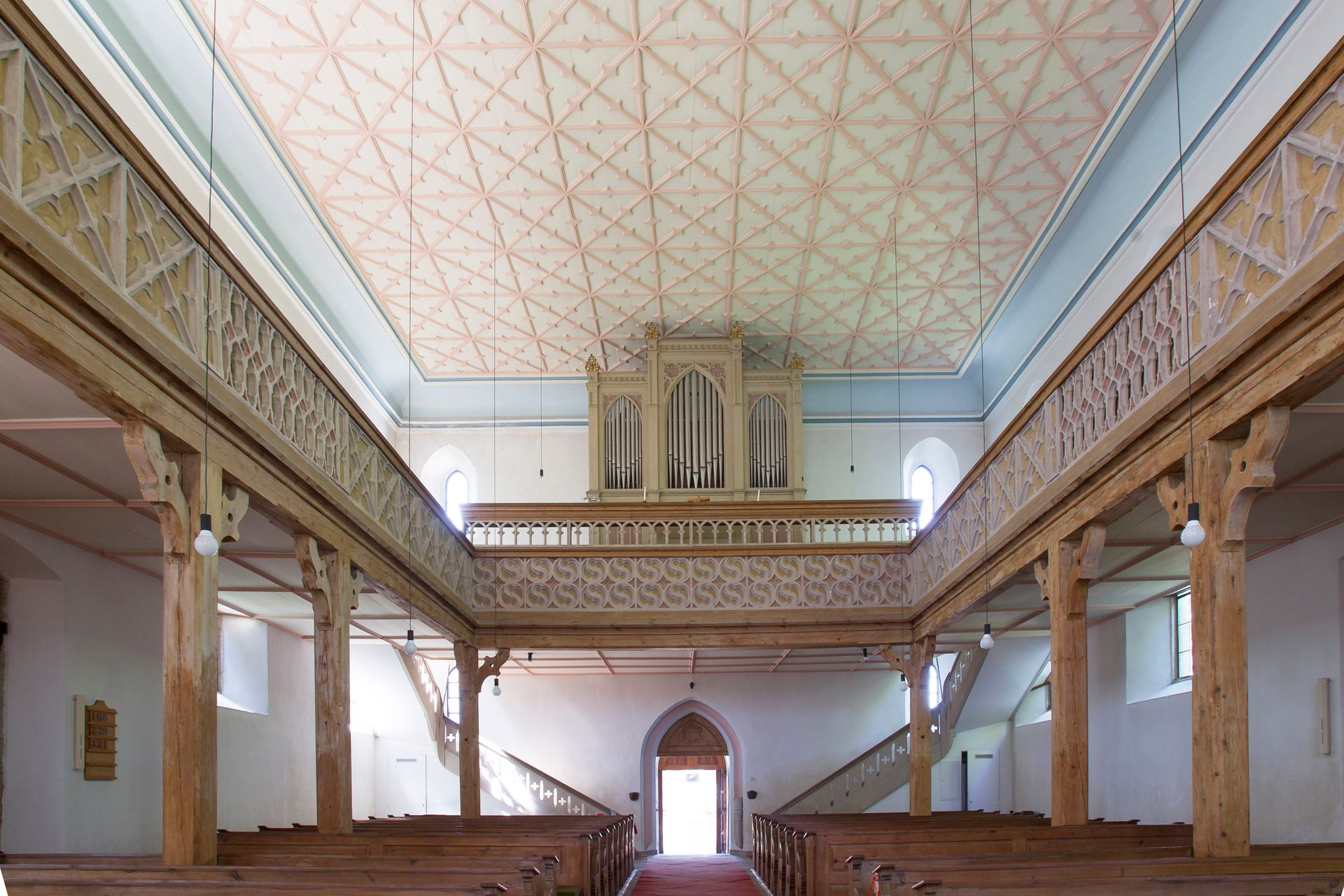 Die Vorgängerkirche hatte man wegen Baufälligkeit abreißen müssen. Die Holzornamente an der Decke und an den Emporen geben dem Kirchenraum ein harmonisches Gepräge. Das Altarbild zeigt die Himmelfahrt Christi, umrahmt von den Aposteln Petrus und Paulus. Von der Spitze des Altars grüßt der Namenspatron der Kirche, der Heilige Georg.
