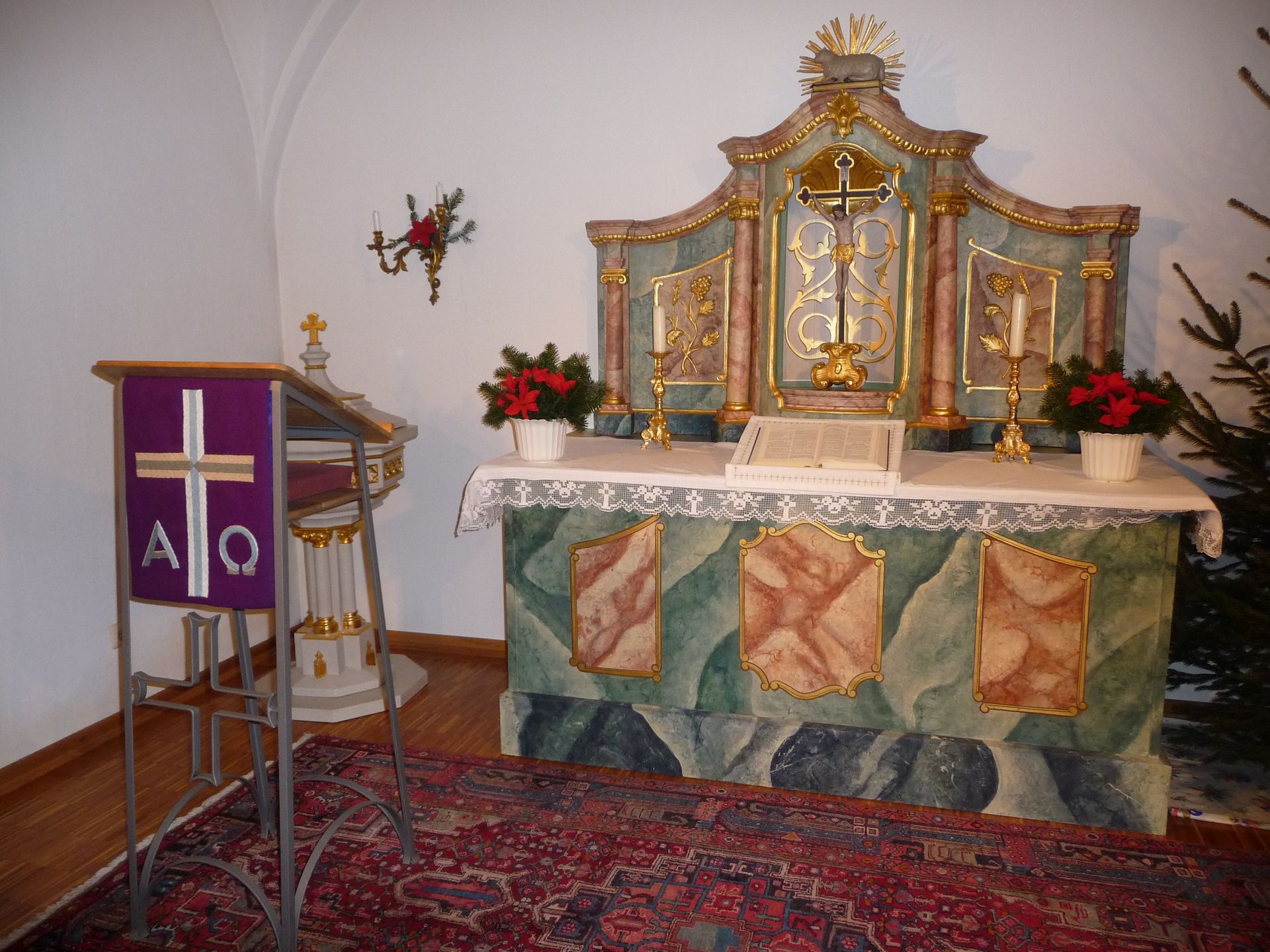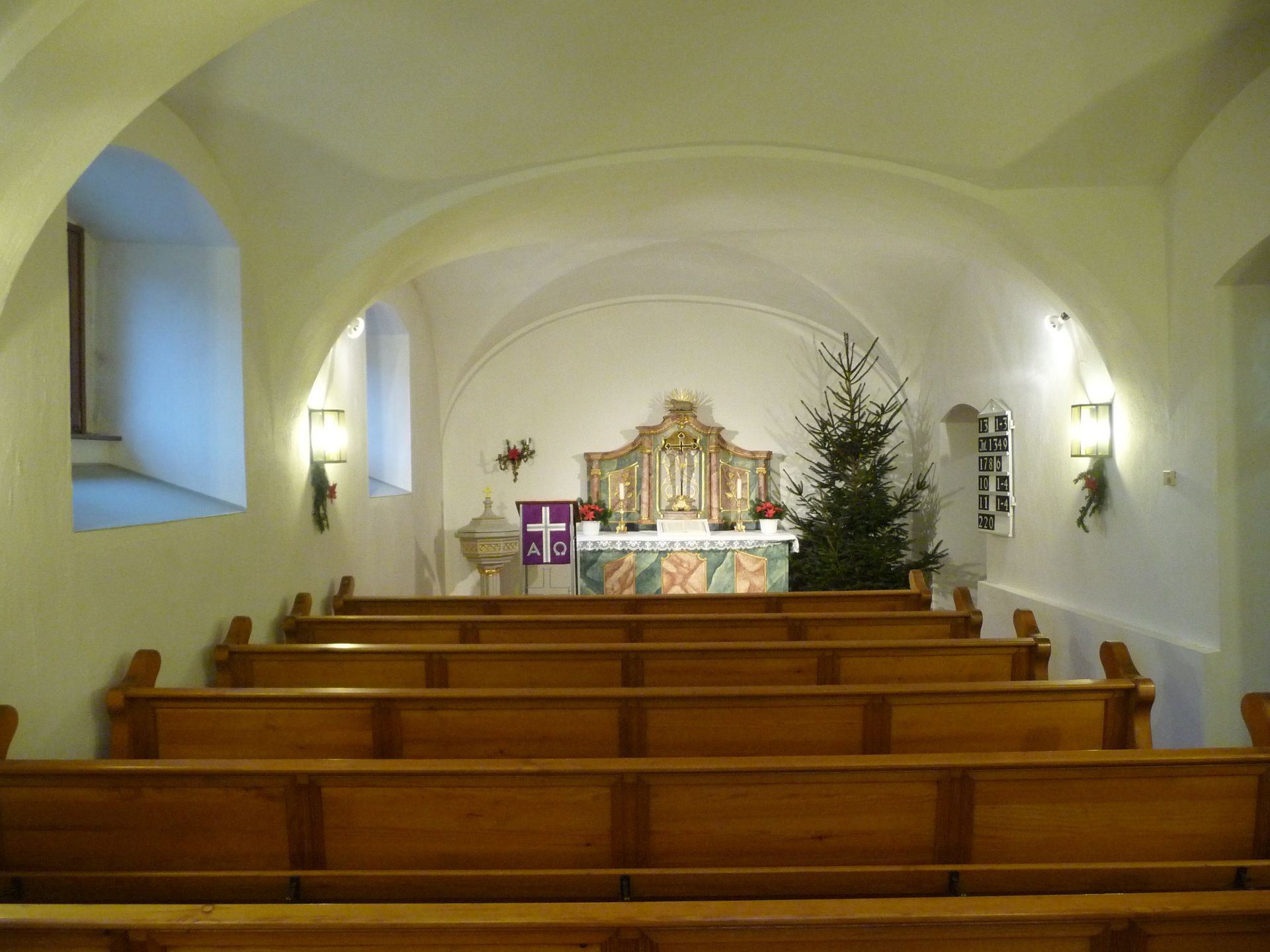Das dreifache Kreuzttonnengewölbe aus der Barockzeit rahmt den kleinen Barockaltar von 1724 im Kirchenraum.