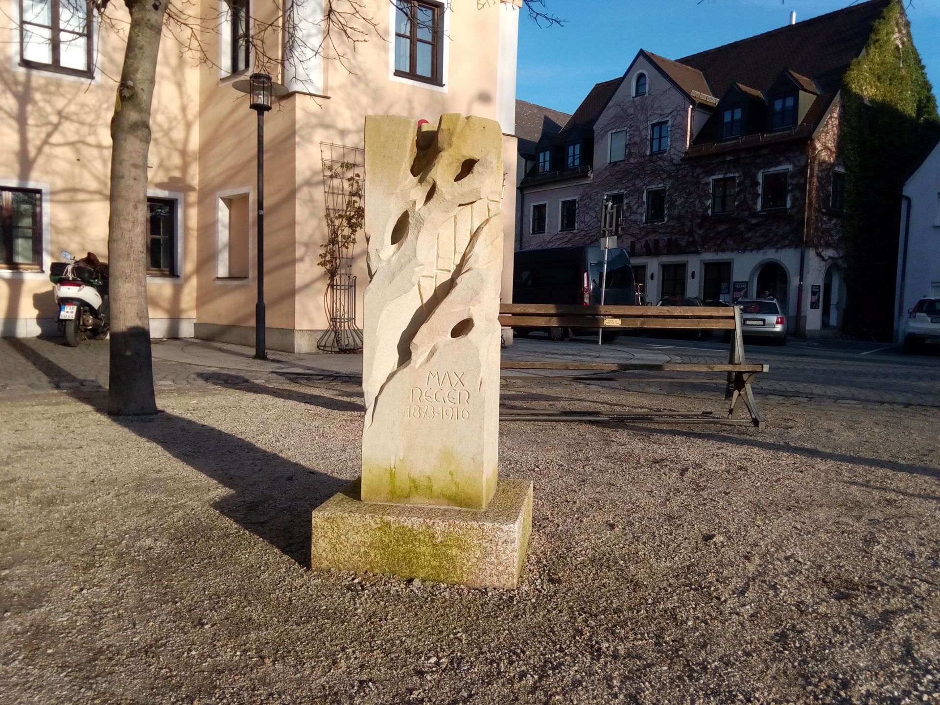 Stilisierte Orgelpfeifen, ergänzt durch Regers Lebensdaten und dessen Zitat vom "Akkordarbeiter", als den sich der Komponist gerne selbst bezeichnete, schuf der Weidener Bildhauer Günter Mauermann aus Kalkstein. Sie finden das Denkmal am Schlörplatz, direkt vor dem Bankhaus.