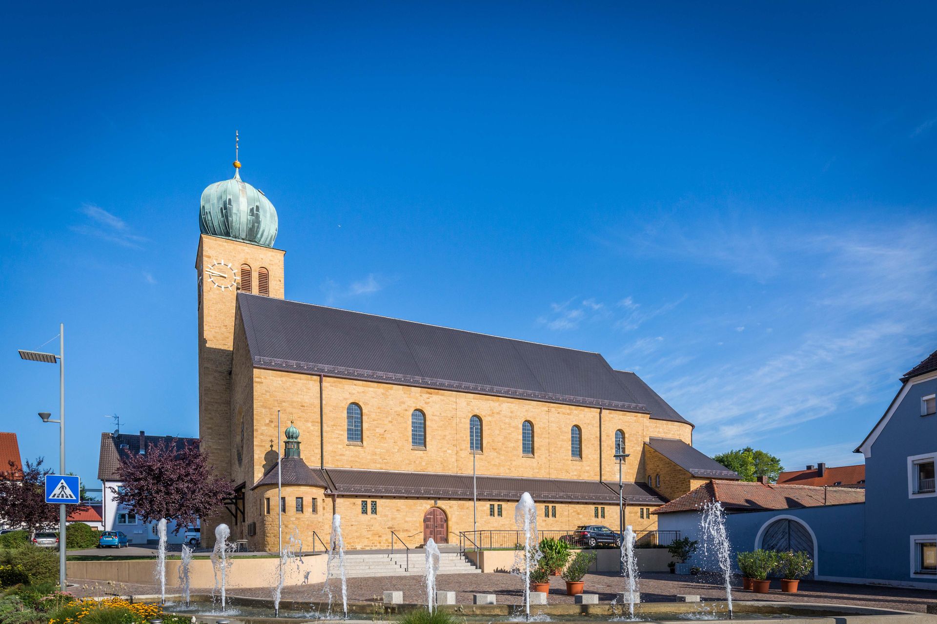 Zwiebelkuppel und gegen Osten das Taufkapellchen, einer Seitenkapelle, an. Das gesamte Bauwerk, fest gefügt aus dem Erzhäuser Sandstein von warmgelber Tönung, macht in seiner edlen Formgebung und wohlabgewogenen Gliederung einen imposanten Eindruck.