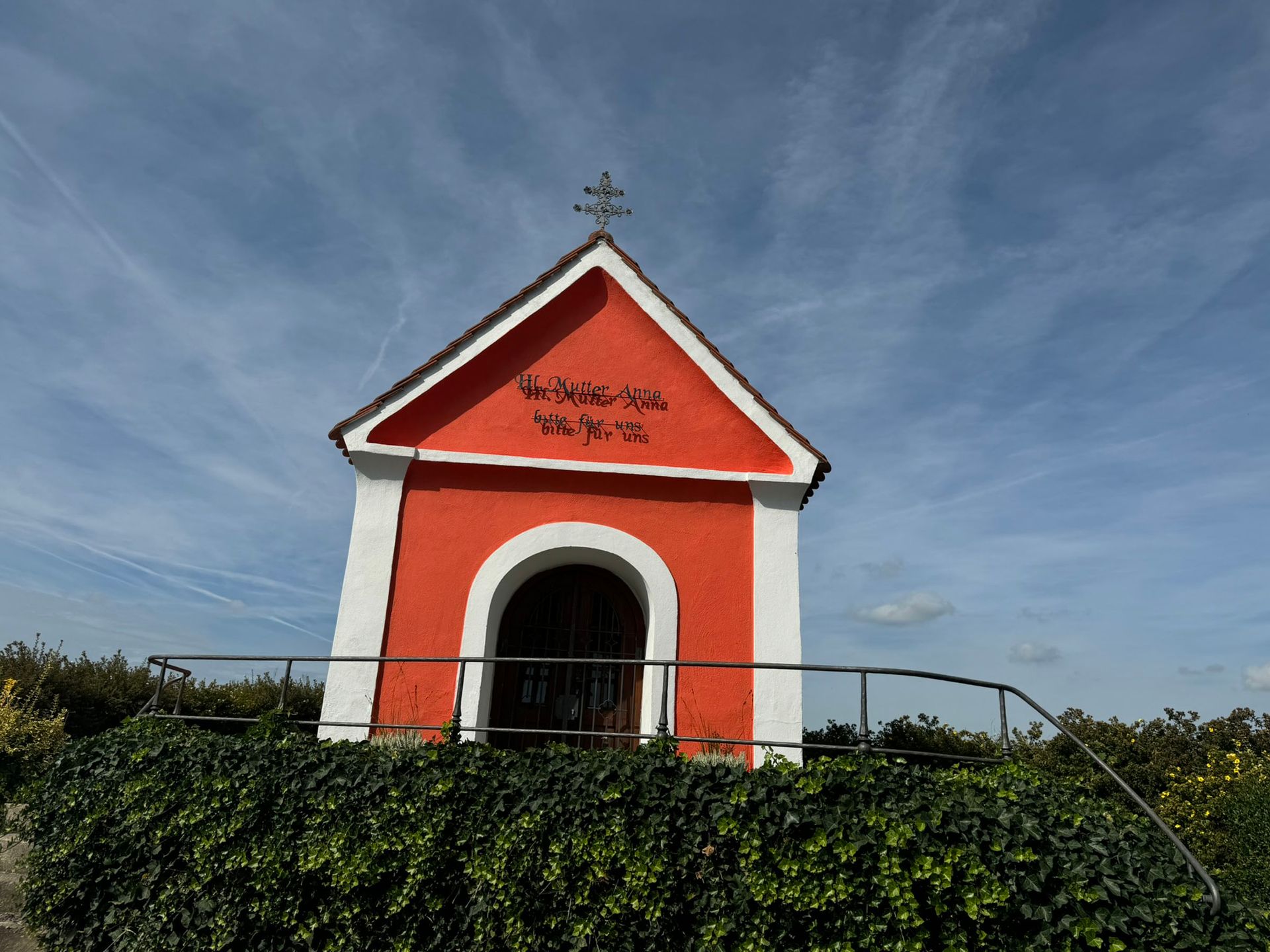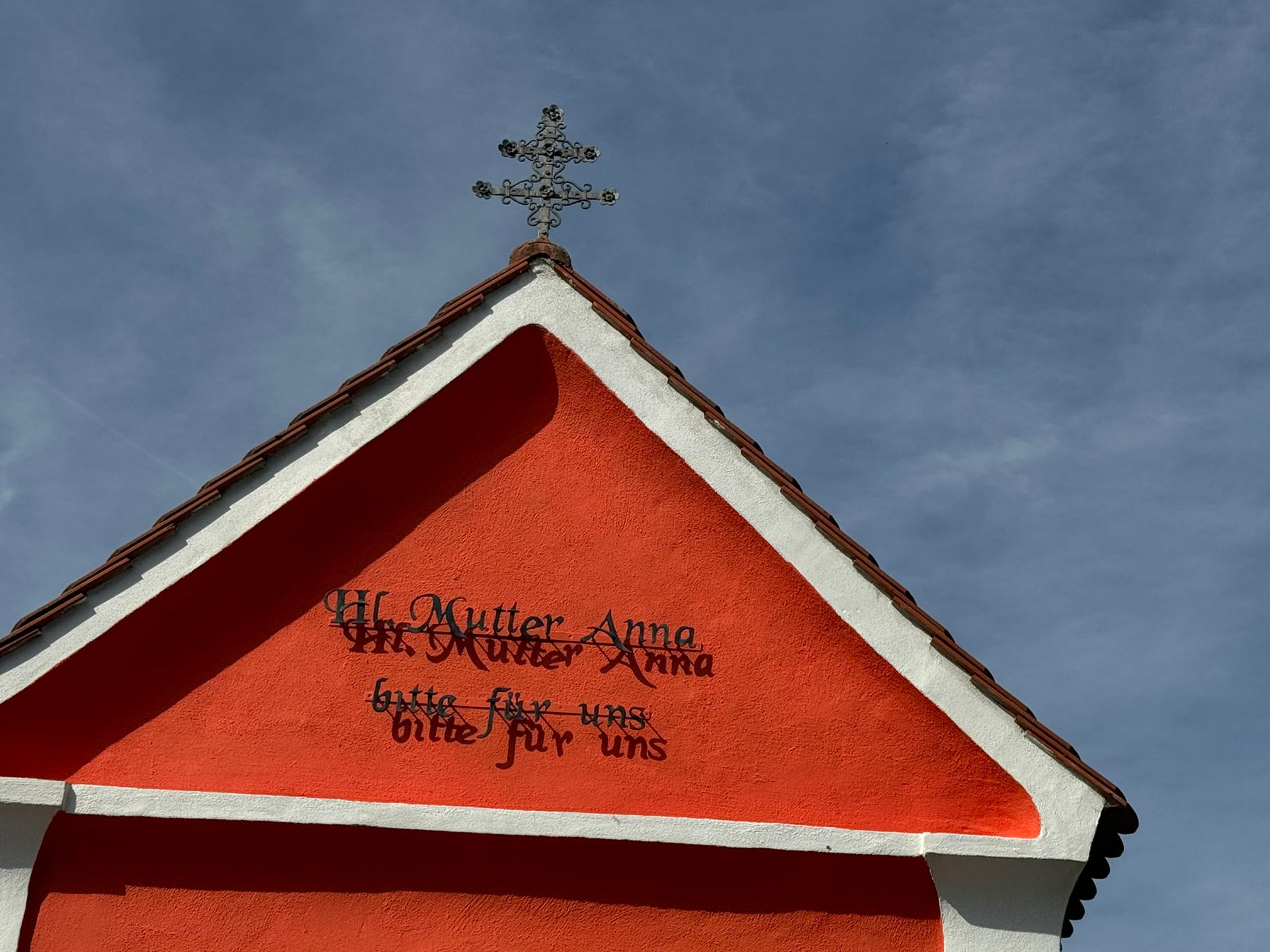 Auf dem Dach sieht man ein doppelbalkiges Eisenkreuz, welches eine schützende Wirkung haben soll, da die oberen Querbalken kürzer sind als die unteren. Es soll vor Hagel, Blitzeinschlägen, Stürmen und Wolkenbruch von den Feldern fernhalten, weswegen es auch "Wetterkreuz" genannt wird.