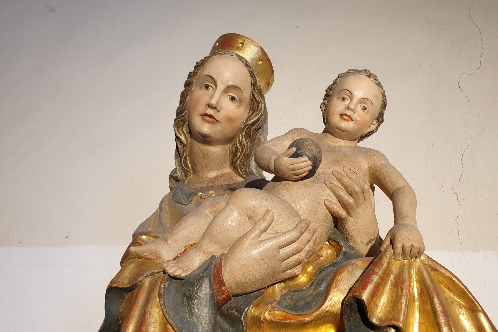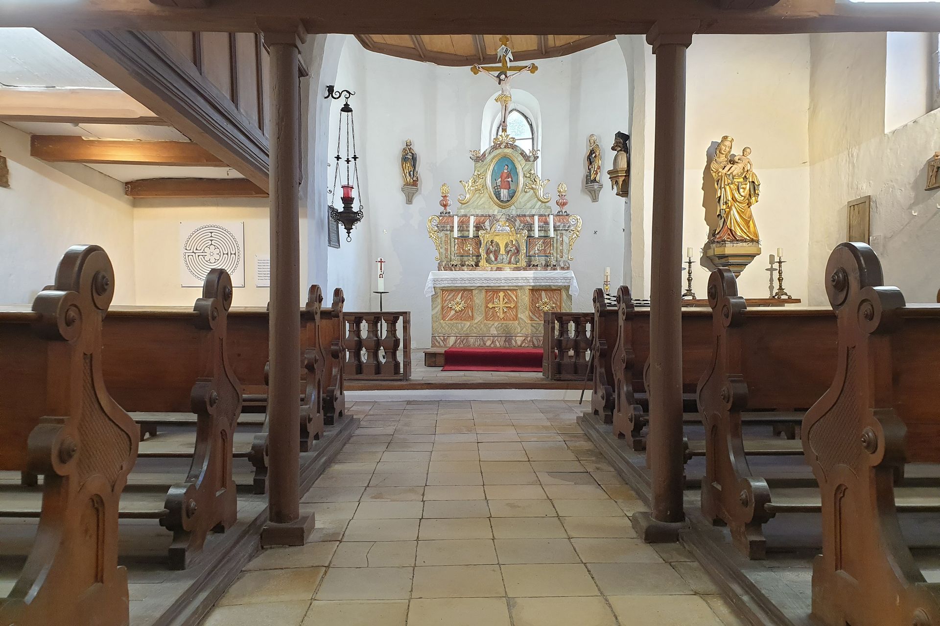 Interessant ist, dass die Kirchenachse abknickt. Der Chorraum ist, wie bei vielen Kirchen üblich, nach Osten in Richtung Sonnenaufgang, ausgerichtet – eine Erinnerung an die Auferstehung am Ostermorgen. Das Kirchenschiff wurde erst später angebaut.
