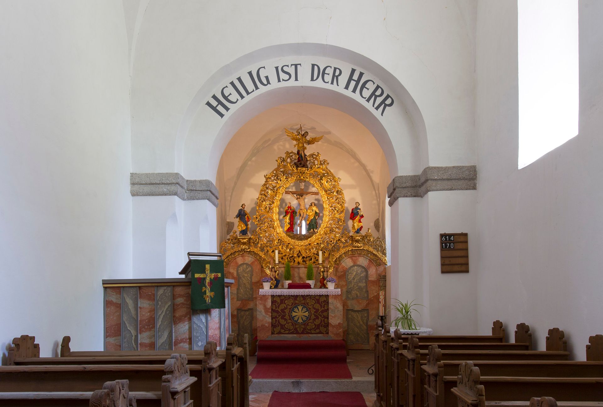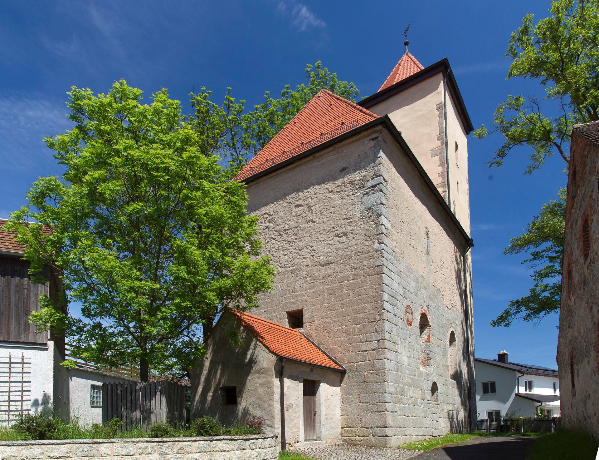 Die ehemalige Burgkapelle St. Michael der Hofmark Schönkirch und heutige ev. Filialkirche stammt aus der Spätromantik. Unter dem Turmdach verbergen sich noch die Zinnen des Burgturms. Die Kapelle, die im Mittelalter dem hl. Jakobus geweiht war, besitzt ein profanes Obergeschoss, in dem wahrscheinlich Pilger übernachtet haben. Zur Ausstattung der Chorturmkirche gehört ein barocker Akanthusaltar von 1720. Der Akanthusrahmen umschließt eine vollplastische Kreuzigungsgruppe. Auf dem Scheitel seht eine Figur des hl. Michael im Kampf mit dem Teufel. Auf den seitlichen rankengeschmückten Torflügeln stehen die hll. Petrus und Paulus. Die Stuhlwangen entstanden um 1700.