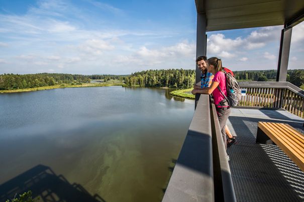 Nach gut 20 Minuten bietet die imposante Himmelsleiter (hier bitte kurz rechts abbiegen) einen atemberaubenden Ausblick auf die Tirschenreuther Teichpfanne mit ihren hunderten Wasserbecken. Über die nicht weniger architektonisch beeindruckende Heusterzbrücke quert der Wanderweg entlang der Waldnaab über die Flure gen Hohenwald. Am Ortseingang grüßt dich charmant das älteste erhaltene Hirtenhaus der Region.