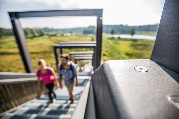 Nach gut 20 Minuten erreichst du die imposante Himmelsleiter, die dir einen atemberaubenden Ausblick auf die Tirschenreuther Teichpfanne mit ihren hunderten Wasserbecken bietet. Über die nicht weniger architektonisch beeindruckende Heusterzbrücke quert der Wanderweg entlang der Waldnaab über die Flure gen Hohenwald. Am Ortseingang grüßt dich charmant das älteste erhaltene Hirtenhaus der Region.