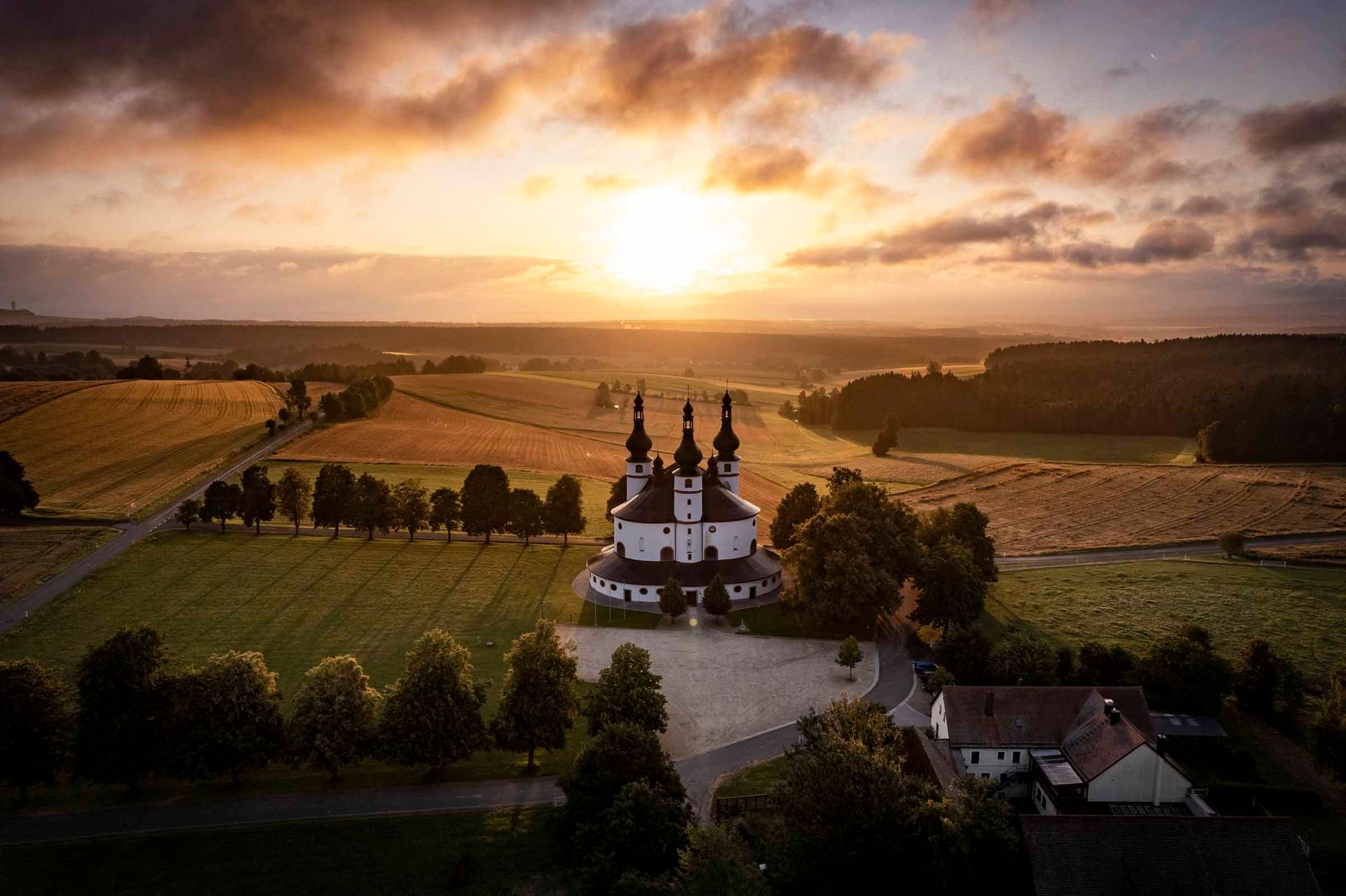 Drohnenaufnahme Dreifaltigkeitskirche Kappl bei Sonnenaufgang